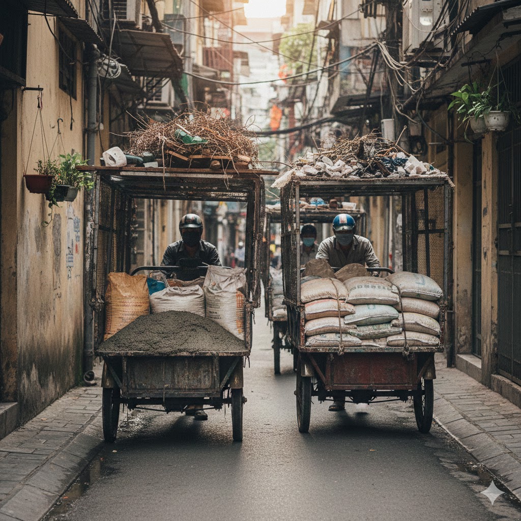 Cách làm: Xe ba gác leo dốc vào tận cổng nhà. Nếu ngõ quá hẹp, đội thợ sẽ dùng xe rùa trung chuyển ra đường lớn. Chúng tôi cam kết không làm ảnh hưởng đến việc đi lại của bà con lối xóm.