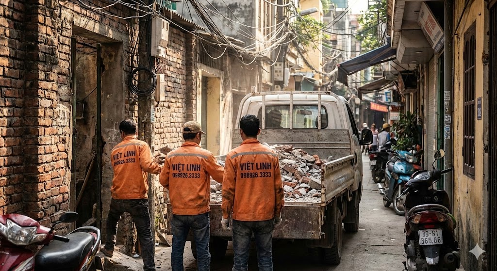 Cách làm: Xe ba gác vào tận cổng (nếu ngõ >2m). Nếu ngõ nhỏ hơn, chúng tôi dùng xe rùa trung chuyển ra điểm tập kết. Đội ngũ thợ khỏe, nhiệt tình, không ngại vất vả.